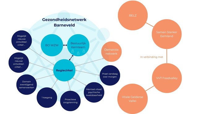 Om deze ambitie te realiseren, organiseren we onszelf in het Gezondheidsnetwerk Barneveld. Het netwerk vormt voor inwoners, de partijen in Barneveld en de regio(‘s) het aanspreekpunt voor ideeën en initiatieven voor gezondheid in Barneveld. Zo brengen we de initiatieven samen, zorgen we dat ze leren van elkaar, en waar nuttig kunnen we initiatieven mogelijk combineren tot nieuwe gedeelde werkwijzen. Ook netwerken moeten georganiseerd en bestuurd worden. Het principe van Governance in Netwerken is “Samen Sturen”, simpelweg omdat iedere deelnemende partij iets wezenlijks in te brengen heeft voor de Gezondheid in Barneveld. Daarom organiseren we de gezamenlijke ontwikkeling op de focusthema’s in ontwikkelcirkels. De inrichting van de Regiecirkel, de Netwerkregisseur, het Bestuurlijk Kernteam en het Bestuurlijk Overleg Wonen, Zorg en Welzijn zorgen voor stabiliteit en bestuurlijke borging in de duurzame samenwerking.
